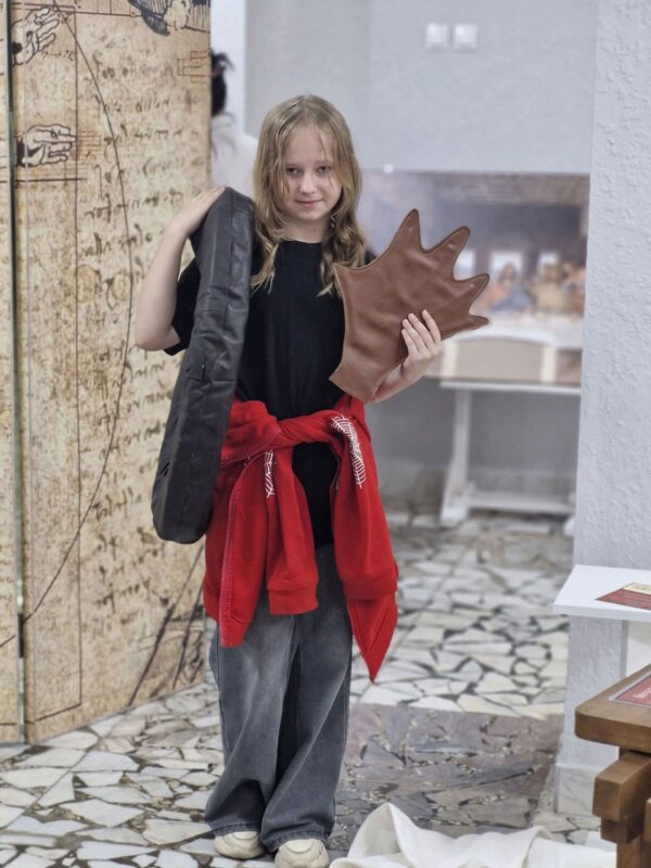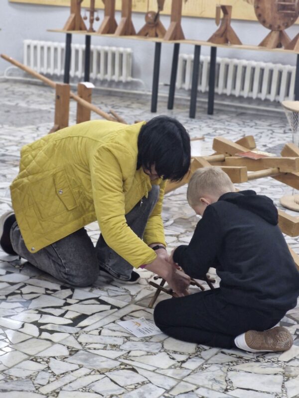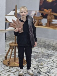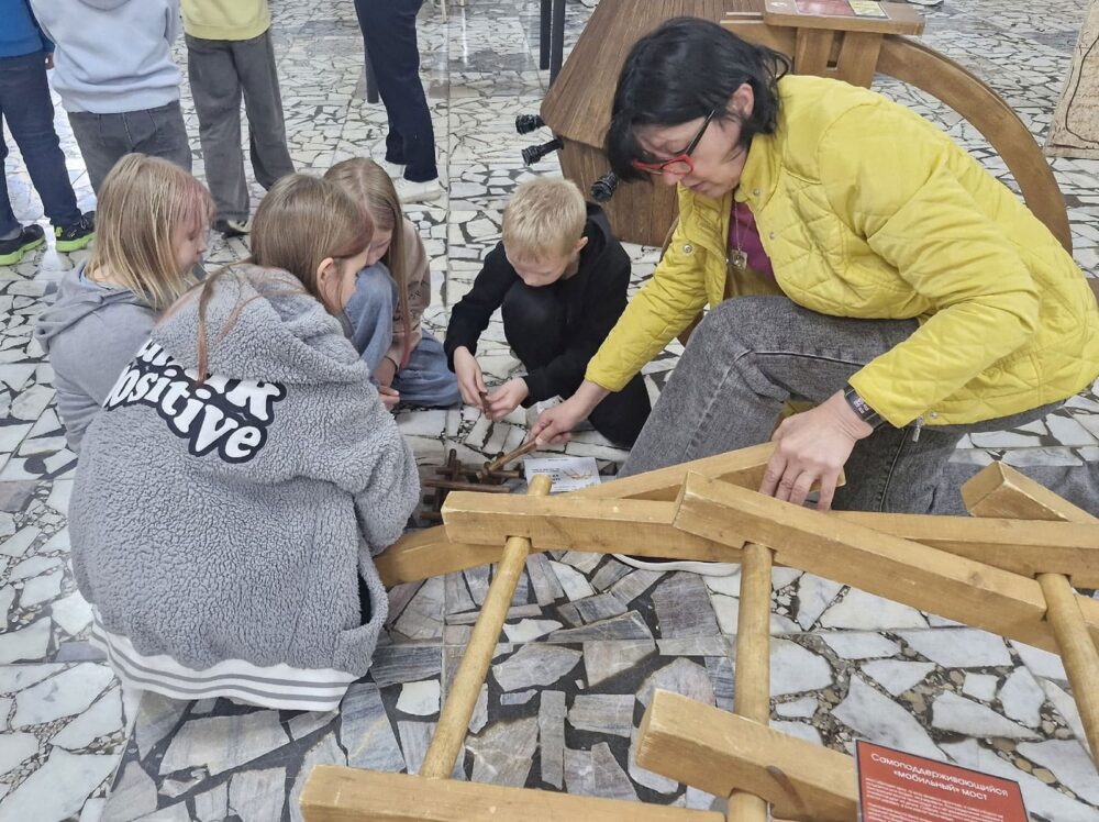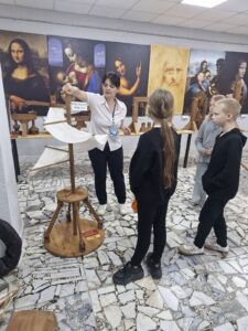 Ребятам предлагают пройти тест «Жизнь гения: удивительные истории о Леонардо да Винчи», а затем проводят увлекательную экскурсию по выставке механизмов, которые изобрел гениальный ученый.
