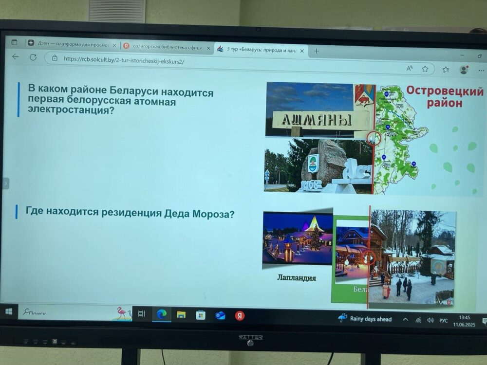 «С любовью о Беларуси» — новая интеллектуальная онлайн-викторина, которая была подготовлена специально к сезону летних школьных каникул. Эта игра – результат совместного труда библиотекарей читального зала и отдела автоматизации библиотечных процессов. Интересные вопросы, необычная техническая реализация викторины делают эту интеллектуальную игру захватывающей и азартной. Учащихся ГУО «Средняя школа № 14 г.Солигорска», которые посетили библиотеку 9 и 11 июня, ждали разнообразные темы новой викторины, разные уровни сложности, возможность посоревноваться с друзьями и получить бонусы.