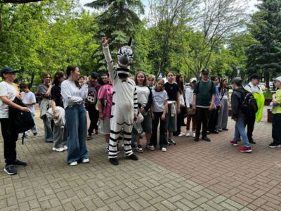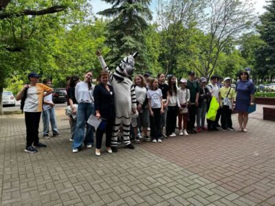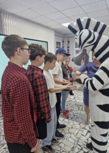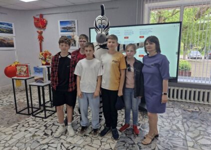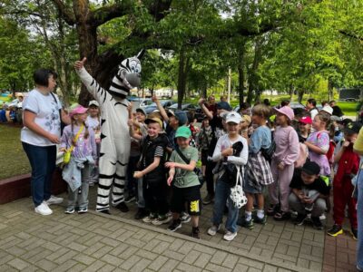 Прежде, чем окунуться в атмосферу книгопорта, веселый друг библиотеки зебра Мартин помог ребятам создать хорошее настроение и сделать танцевальную разминку в библиодворике.