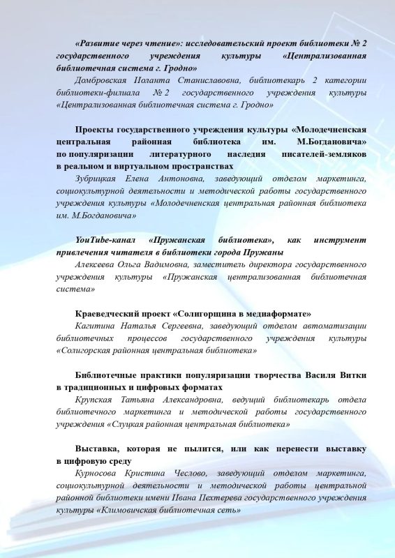 Организаторы форума — Институт повышения квалификации и переподготовки кадров БГУКИ совместно с Борисовской центральной районной библиотекой им. И.Х. Колодеева — провели мероприятие под эгидой Челябинского государственного института культуры.