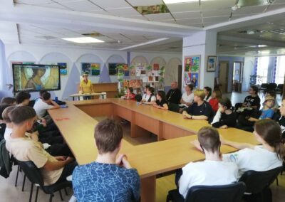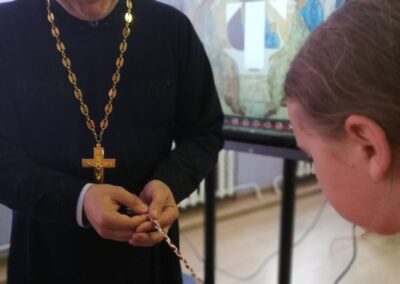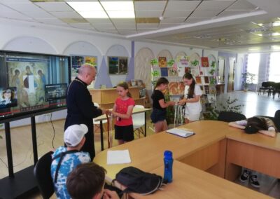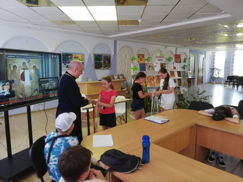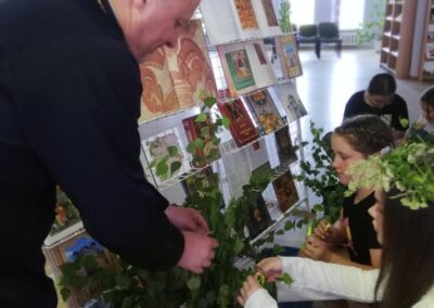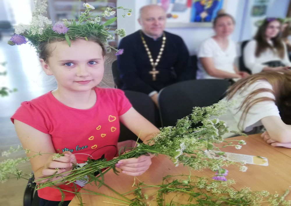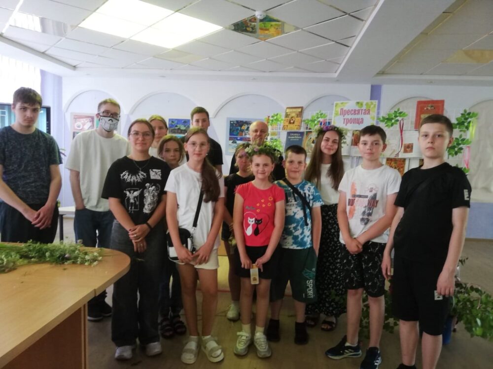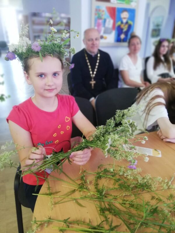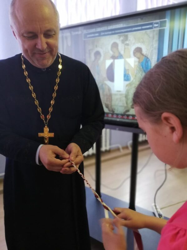 Почетный гость мероприятия иерей Владимир (Ворошкевич), клирик кафедрального собора Рождества Христова г. Солигорска, объяснил присутствующим, что значит сошествие Святого Духа на апостолов, подробно рассказал об иконе Андрея Рублёва «Троица». Рассказ сопровождался просмотром видеоролика «Пресвятая Троица Андрея Рублёва».