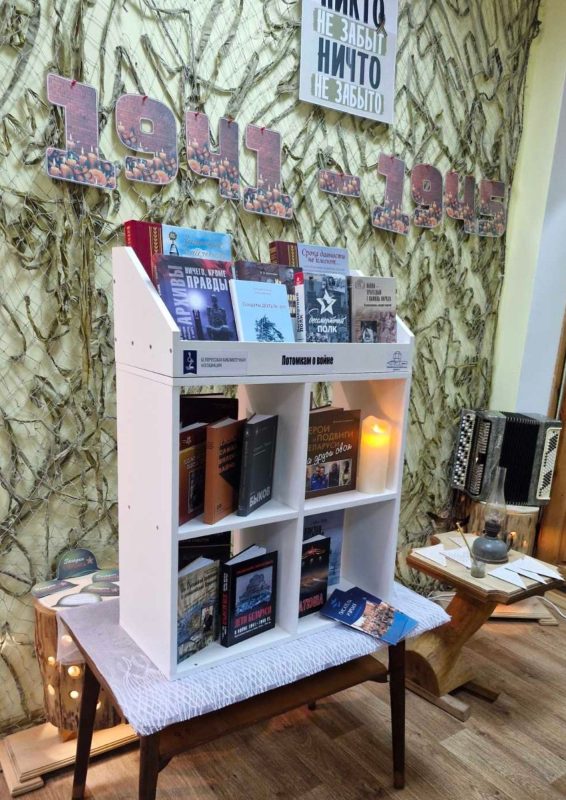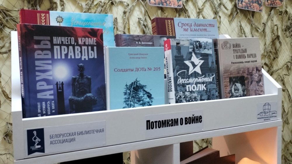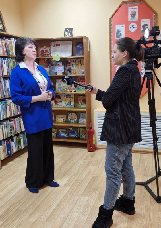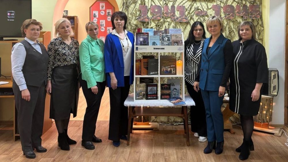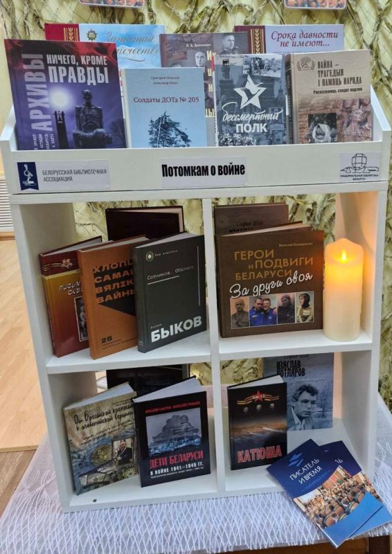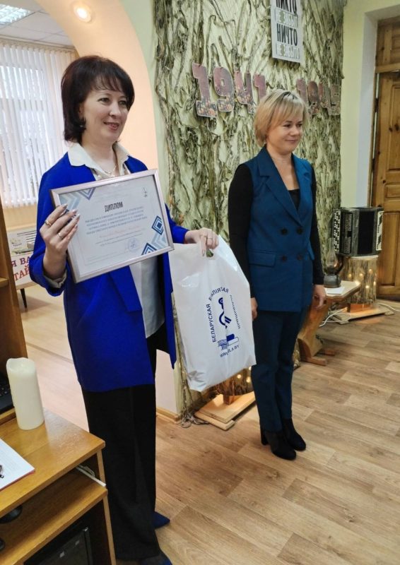 Кукета Ирина Михайловна, заведующий научно-исследовательским отделом библиотековедения ГУ «Национальная библиотека Беларуси», заместитель председателя комитета по проектной деятельности ОО «Белорусская библиотечная ассоциация» и Козлюк Екатерина Игоревна, заведующий сектором обработки периодических изданий отдела библиографической обработки документов, председатель комитета по проектной деятельности ОО «Белорусская библиотечная ассоциация» передали Сакиловой Александре Александровне, заведующему библиотекой, книжную полку «Потомкам о войне», укомплектованную тематической литературой для детей и молодежи.