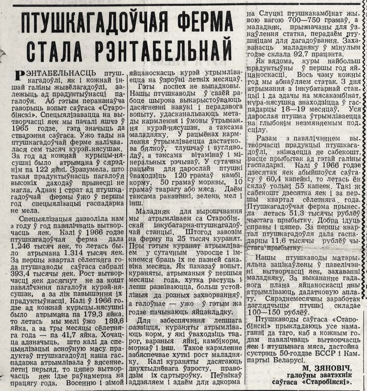 Зяновіч, М. Птушкагадоўчая ферма стала рэнтабельнай / М.Зяновіч // Шахцёр. — 1968. — 12 красавіка. — С.2
