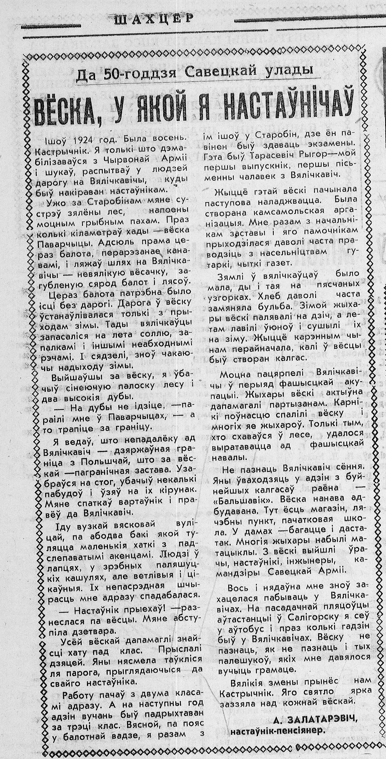 Залатарэвіч, А. Вёска ў якой я настаўнічаў / А Залатарэвіч // Шахцёр. — 1967. — 17 студзеня. — С.2