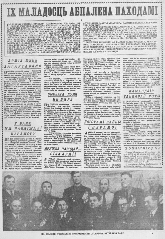 Редакция районной газеты провела встречу с ветеранами боёв за Родину, которые вспомнили былые походы, славные страницы Советской армии, рассказали о ее боевых традициях. На встрече присутствовал горвоенком подполковник Сидоренко, директор второй средней школы, капитан запаса Маркевич, кавалер трех орденов славы Диулин и т.д.