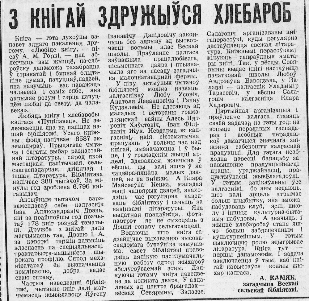 Камяк,А. З кнігай здружыўся хлебароб / А.Камяк // Шахцёр. — 1968. — 10 лютага. — С.2