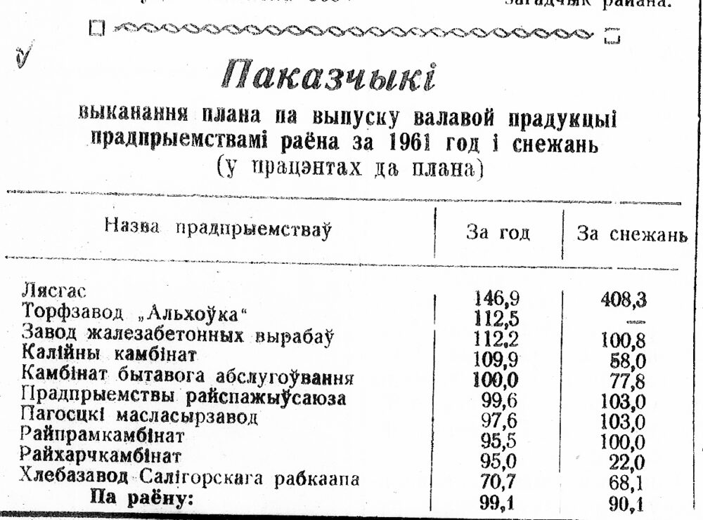 Паказчыкі выканання плана па выпуску валавай прадукцыі прадпрыемствами Салігорскага раёна за 1961 год // Савецкі патрыёт. — 1962. — 13 студзеня. — С.4