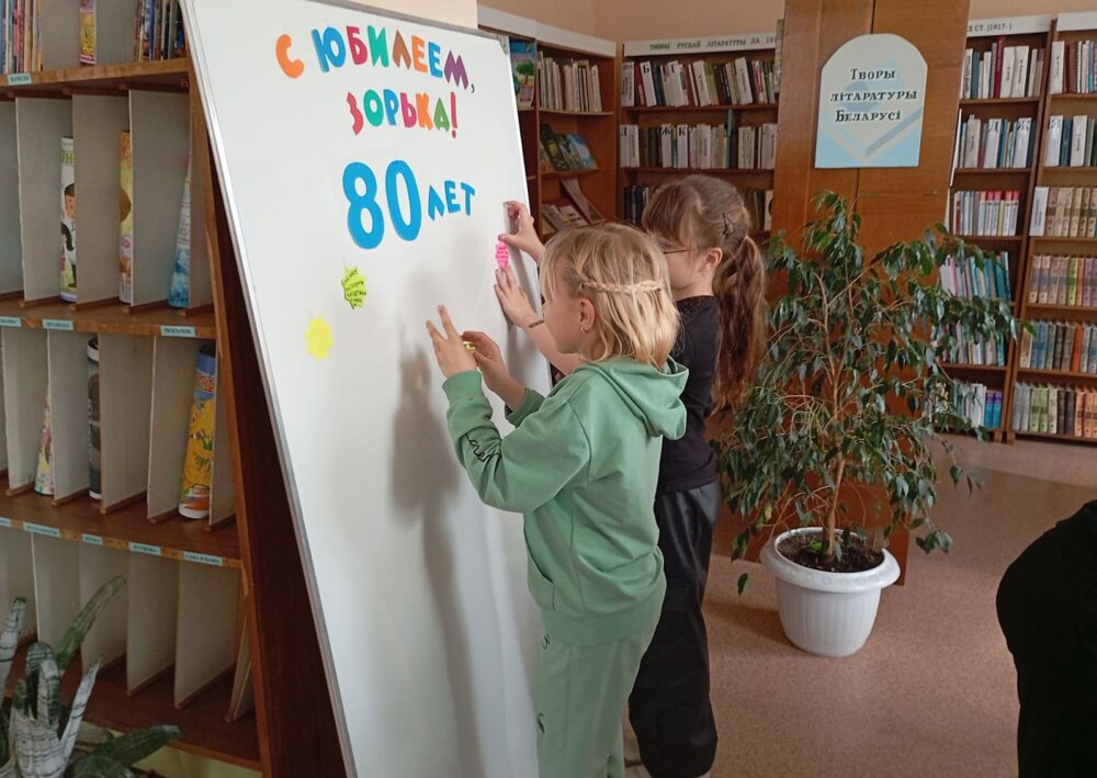 В связи с этой замечательной датой Краснослободская горпоселковая экологическая библиотека инициировала оформление праздничной открытки «С юбилеем, любимая газета!». Ребята из оздоровительного лагеря «Весенняя капель» ГУО «Краснослободская средняя школа Солигорского района» решили присоединиться к поздравлениям в адрес юбиляра. На разноцветных звездочках они писали свои поздравления и пожелания любимой газете, а затем прикрепляли их на поздравительную открытку.