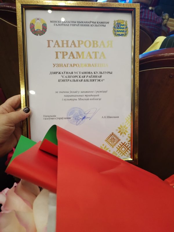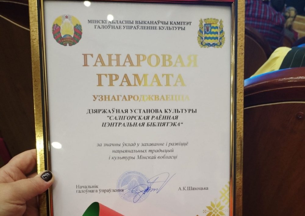 Почётной грамотой главного управления культуры Миноблисполкома награждён коллектив ГУК «Солигорская центральная районная библиотека». Высокую награду директору, Людмиле Адамовне Муравейко, вручила начальник главного управления культуры Минского областного исполнительного комитета, Алла Константиновна Шахотько.