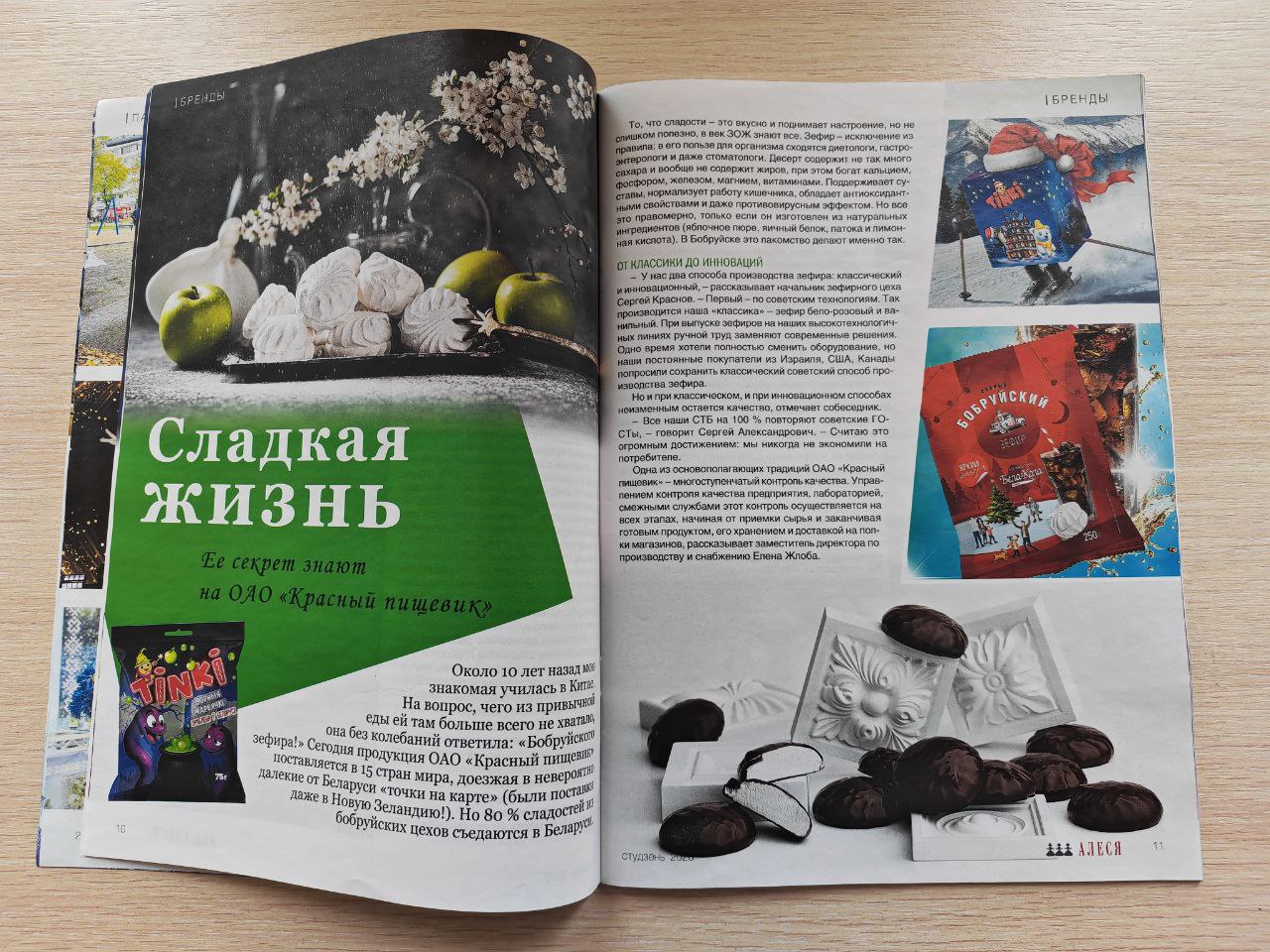 «Вкусная» публикация «Сладкая жизнь» в январском номере «Алеси» — тоже весомая добавка к праздничному настроению. Секрет ее знают на ОАО «Красный Пищевик». Кто не знает наш бобруйский зефир? Продукция эта поставляется в 15 стран мира, доезжая в невероятные для Беларуси «точки на карте». Но не переживайте: 80% сладостей из бобруйских цехов съедаются у нас, в Беларуси. Прочитав эту статью, гарантируем, что вы сразу же отправитесь за яркими, новыми, интересными лакомствами, чтобы продегустировать весь ассортимент предприятия.