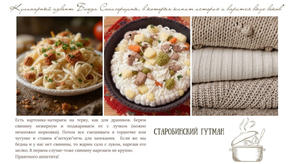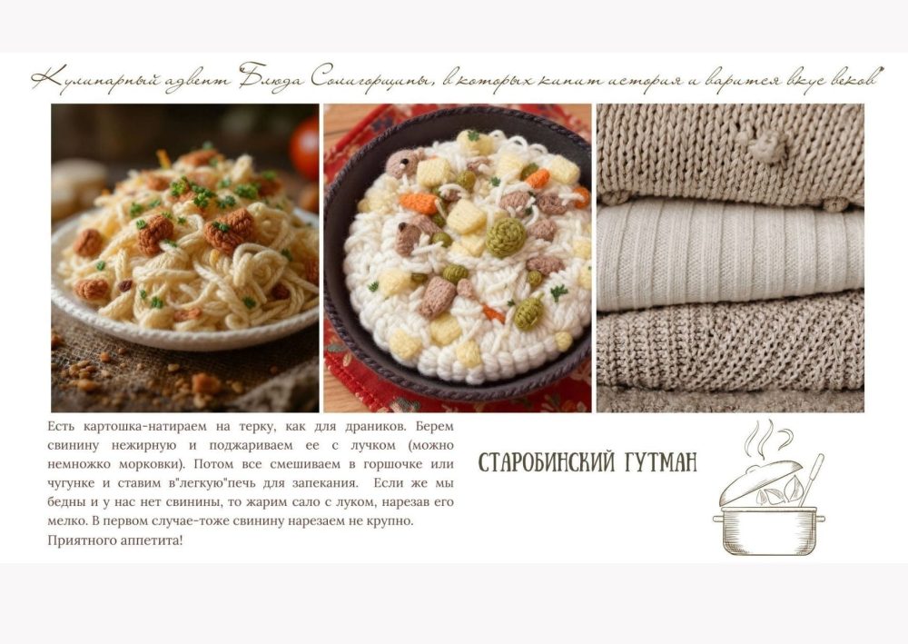 Рецепт этого блюда надиктовала солигорским библиотекарям читательница из Старобина. Происхождение названия – «гутман» – она не знала, но уверяла, что так его называют многие. Библиотекари покопались в книгах, статьях и в Google и предположили следующее: в названии явно прослеживаются еврейские корни (гутман в переводе с идиша – «хороший человек»). А так как в Старобине уже в начале XVII в. была образована еврейская община, то почему бы блюду так не называться? Непонятно, впрочем, почему так назвали блюдо, напоминающее итальянскую пиццу, но нам отследить логистическую цепочку не удалось. Ну а «старобинским» назвали его авторы вязаного адвента, чтобы указать на местность, где этот самый гутман и готовится.