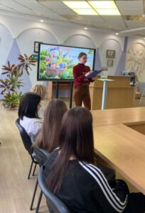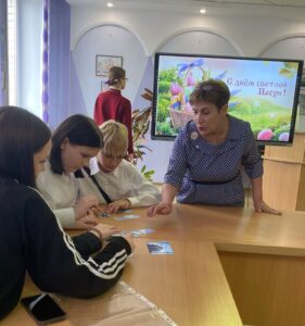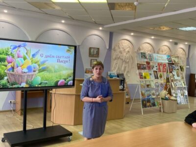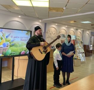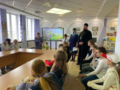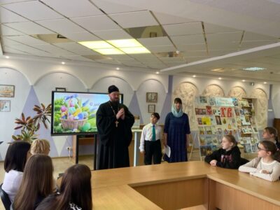 В преддверии светлого праздника Пасхи в зале искусств районной центральной библиотеки прошел тематический час «Славься, светлая Пасха!». Пасха – главный христианский праздник Светлого Воскресения Христова. В мероприятии приняли участие учащиеся 5-8 классов ГУО «Средняя школа №14 г. Солигорска». Иерей Дмитрий Новиков, настоятель храма Святителя Николая Чудотворца и его жена матушка Наталья поздравили гостей с наступающей Светлой Пасхой, познакомили ребят с историей православного праздника и его традициями. А также в исполнении отца Дмитрия и матушки Натальи прозвучали пасхальные песнопения «Звезда любви» и «Люди ликуйте, народы пойте».
