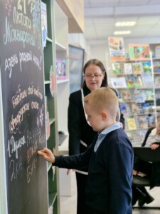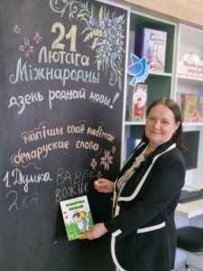 Алена Міхайлаўна правяла з дзецьмі чытацкаю эстафета «На мове роднай размаўляю». Яна прапанавала на грыфельнай дошцы напісаць сваё любімае слова на беларускай мове.