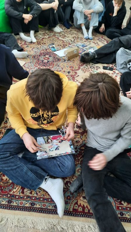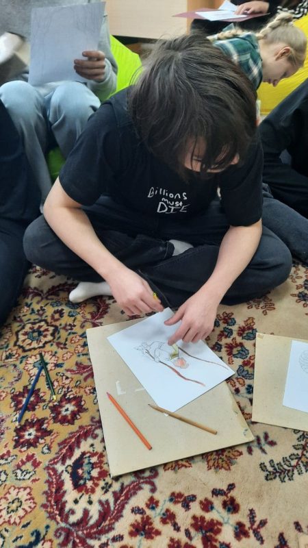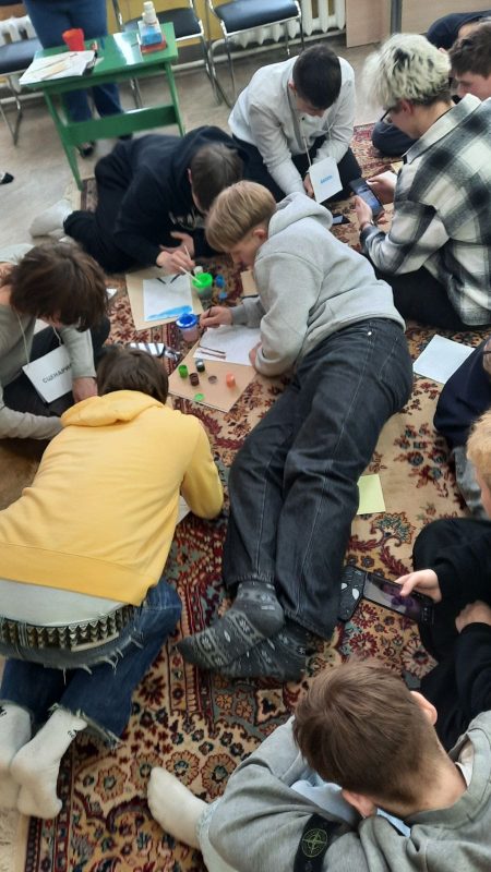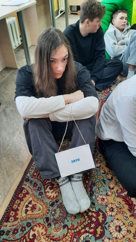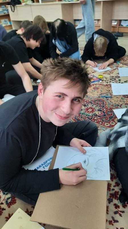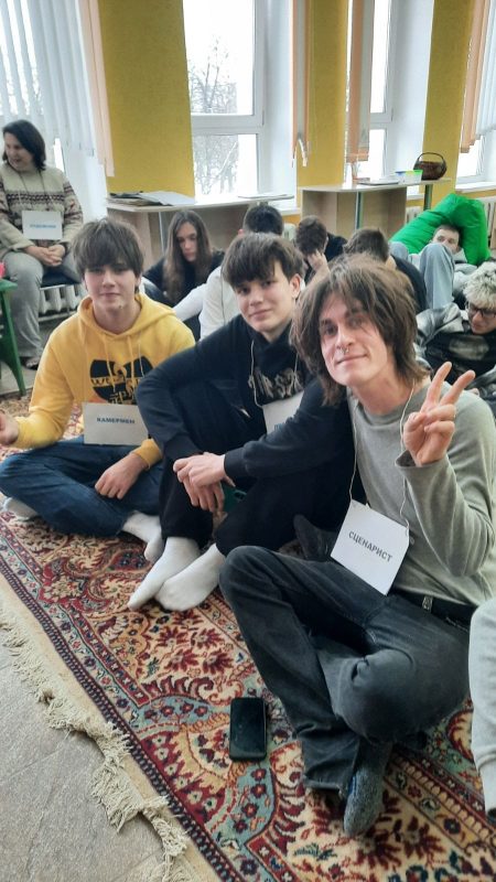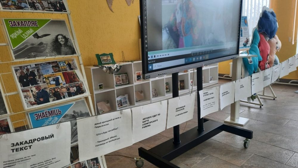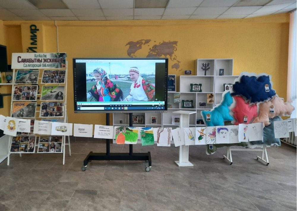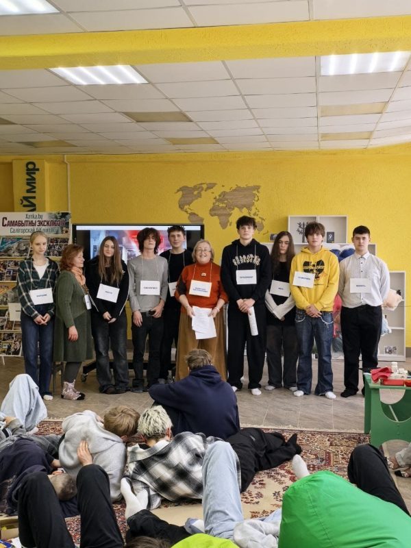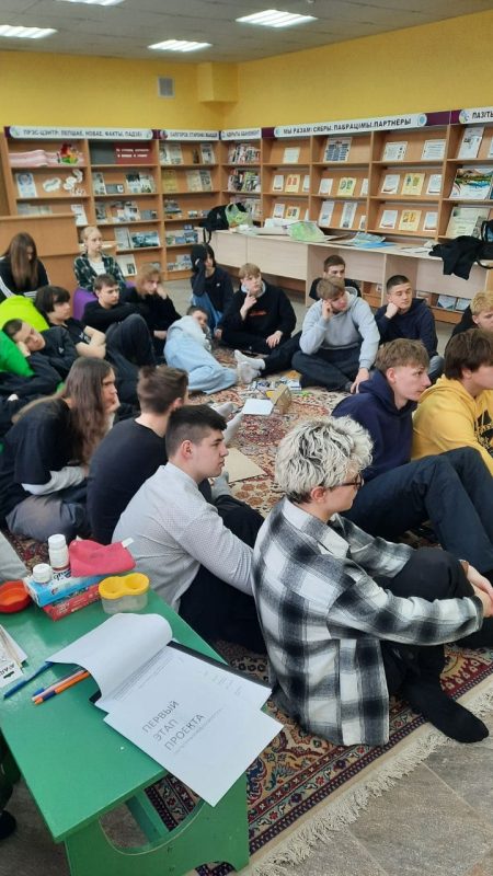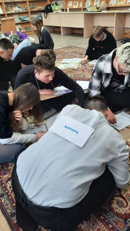 24 января рассказ об этой творческой коллаборации впервые услышали студенты Солигорского государственного колледжа и члены детского клуба «Sunlight» ГУО «Средняя школа №4 г. Солигорска». И не просто посмотрели – послушали, а стали впоследствии вовлеченными участниками яркого и шумного процесса – знакомства с основными этапами создания мультипликационного фильма об обряде «Закалыхванне» д. Гаврильчицы Солигорского района. Интерактивным и познавательным стало мероприятие благодаря креативным библиотекарям: громкое чтение сценария, созданного в ChatGPT, промпт для которого написали сами организаторы, создание «веревочного» сториборда (доски историй) со сценарными карточками, педагог-художник, объясняющий азы рисования мультипликации и необычный массовый пленэр на мягком библиотечном ковре.