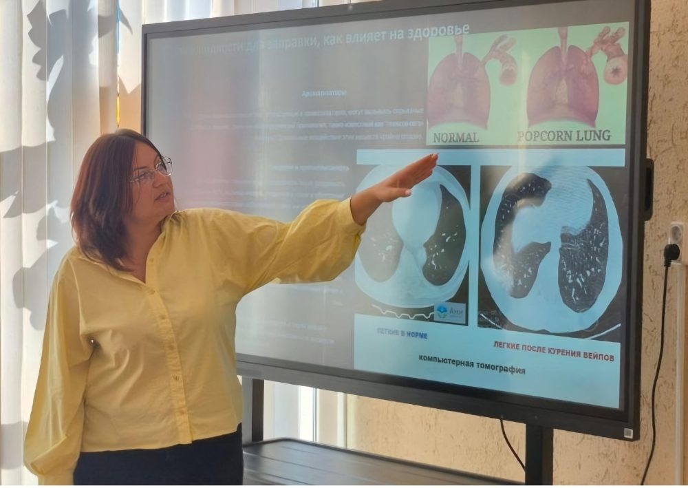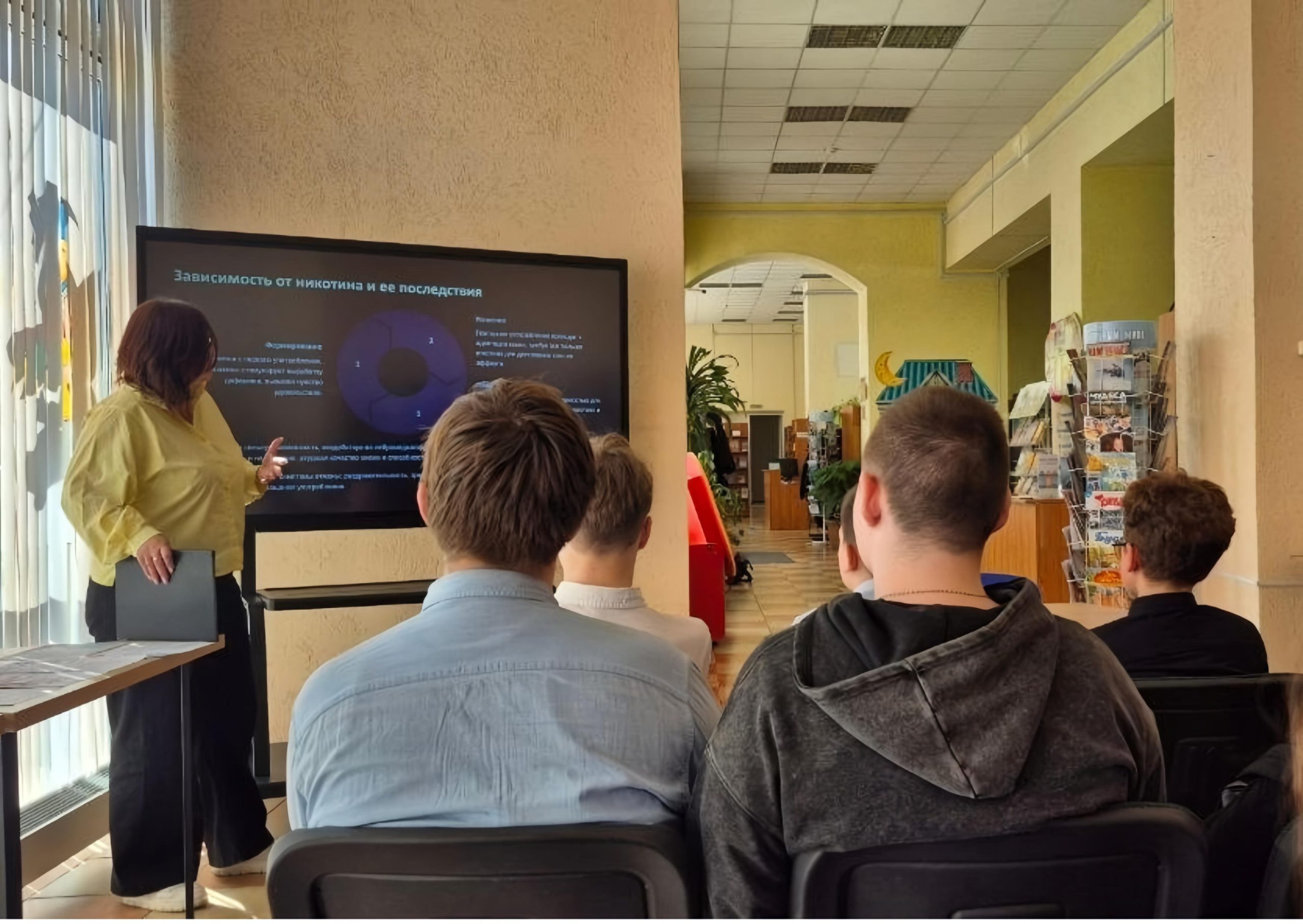 В Солигорской районной детской библиотеке прошла встреча-размышление «Моладзь Беларусі на хвалі здароўя», посвященная Всемирному дню здоровья. На мероприятии присутствовали учащиеся 7 «А» и 8 «А» классов ГУО «Средняя школа №8 г. Солигорска». Выступающие и участники мероприятия определили главные составляющие здорового образа жизни: распорядок дня, свежий воздух, движение, здоровое питание, а также эмоциональное состояние. Большое внимание уделили профилактике вредных привычек. Дети просмотрели презентацию о вреде курения вейпов. О том, что скрывается за облаком вредного пара, ребятам рассказала Елена Александровна Руденя – заведующий отделом общественного здоровья ГУ «Солигорский зональный центр гигиены и эпидемиологии».