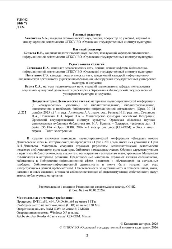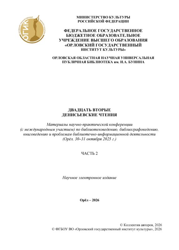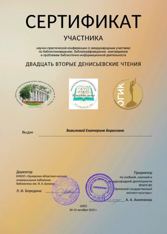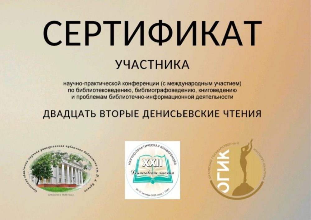 Плодотворный и интересный 2025 год закончился, а к нам в ГУК «Солигорская районная центральная библиотека» продолжают поступать приятные известия. 30 – 31 октября 2025 года на базе Орловской областной научной универсальной публичной библиотеки им. И.А. Бунина и Орловского государственного института культуры состоялась научно-практическая конференция (с международным участием) по библиотековедению, библиографоведению, книговедению и проблемам библиотечно-информационной деятельности «Двадцать вторые Денисьевские чтения», организованная при поддержке Департамента культуры Орловской области.